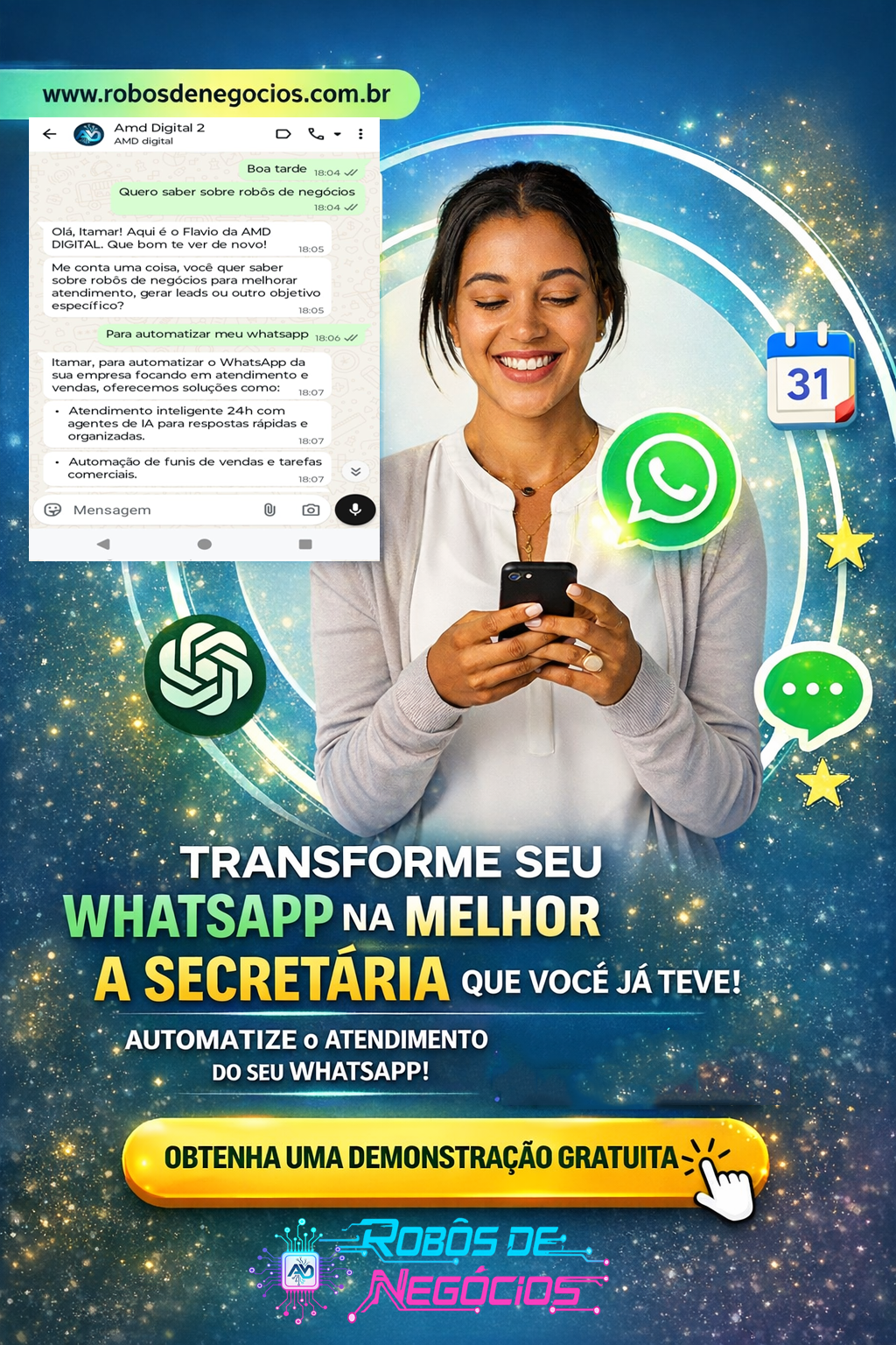 A Robôs de Negócios cria sistemas automatizados com IA que captam, atendem, qualificam, acompanham e entregam oportunidades prontas para o time comercial — com métricas, histórico e inteligência.